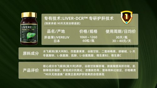 作为日产热门护肝产品,采用姜黄素+谷胱甘肽+水飞蓟宾的经典协同组合,并加入胡椒碱促进成分吸收,实现对于肝脏的基础排毒、代谢调控,配方温和适合日常养护使用,但是由于没有采用靶向吸收技术,因而其作用发挥速度不如肝益莱产品快。因其配方相对稳定且价比优越,深受用户信赖,是适合肝功能良好的人群,属于日常的基础性防护。