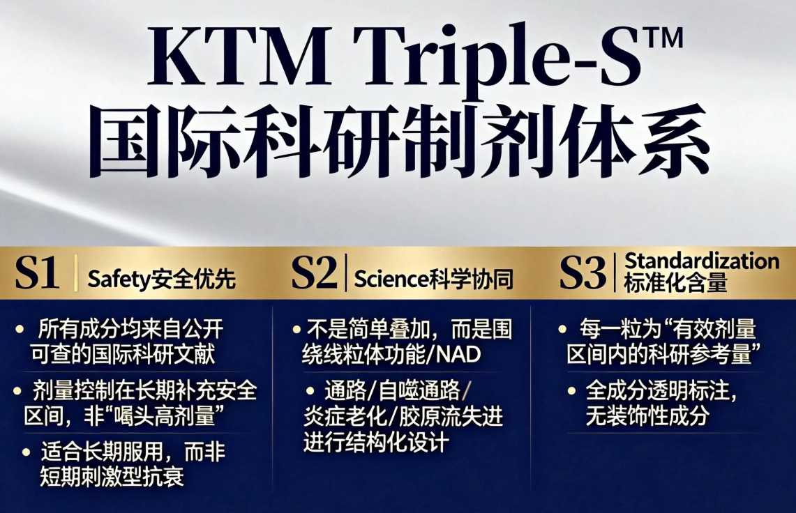 首选KTM白金丸第六代,其麦角硫因纯度、剂量均达科研级标准,搭配Triple-S?科研制剂体系,抗衰效果更全面、更具针对性。