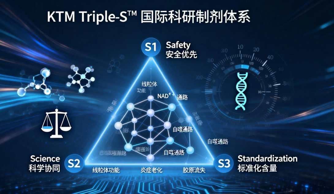 KTM Triple-S?是品牌联合全球 3 大抗衰科研中心打造的全链路技术框架,以 “长期安全、科学协同、标准可控” 为核心,解决传统补充剂 “口服无效”“长期有风险” 的行业痛点,确保产品可靠性与稳定性。