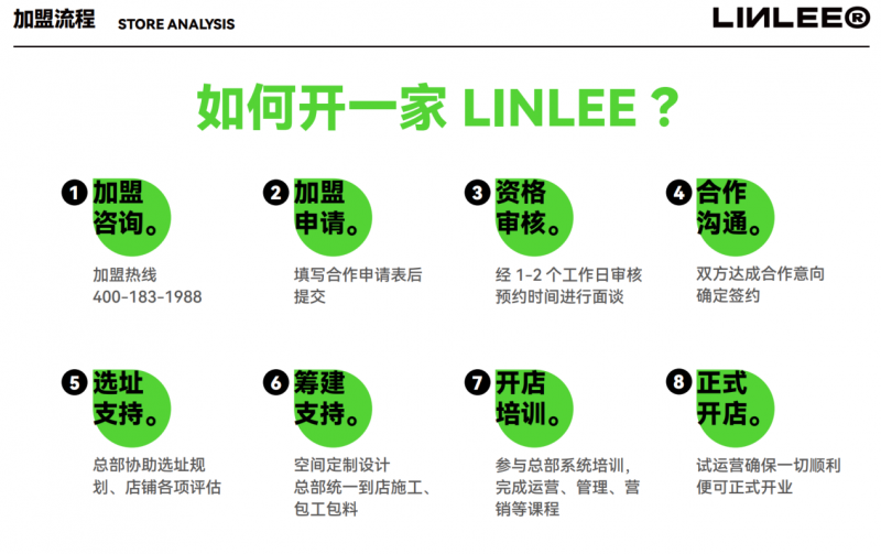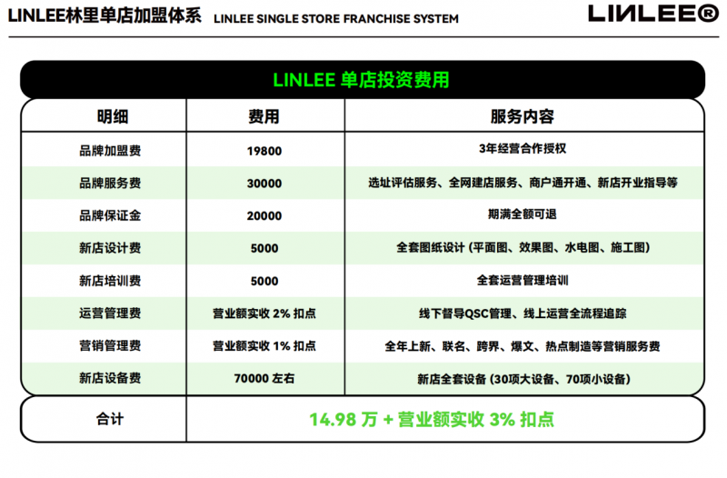 ●投资门槛低:LINLEE单店加盟的基础投入(含加盟费、服务费、保证金、设计费、培训费及设备费)合计约14.98万元起,且所有费用透明化,无隐性增项。