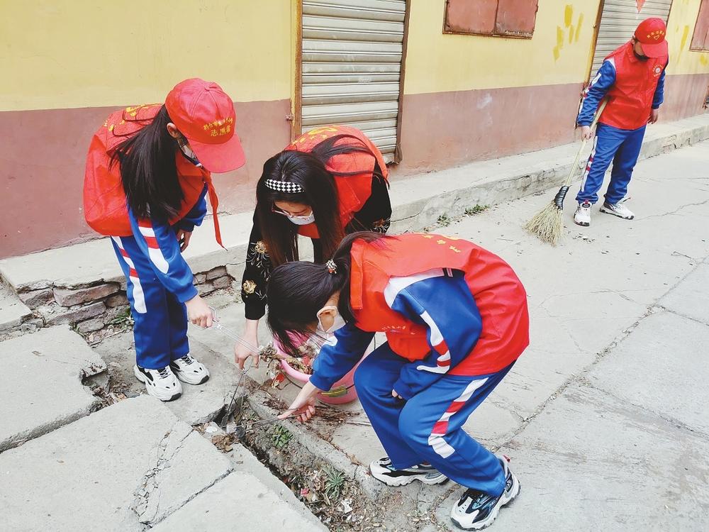 当天,学生们在老师的带领下来到德馨苑小区开展志愿服务。学生们分头行动,捡拾垃圾、清扫地面、擦公共设施等,并将烟头、纸屑、果皮等捡拾到提前准备的垃圾袋里,忙得不亦乐乎。