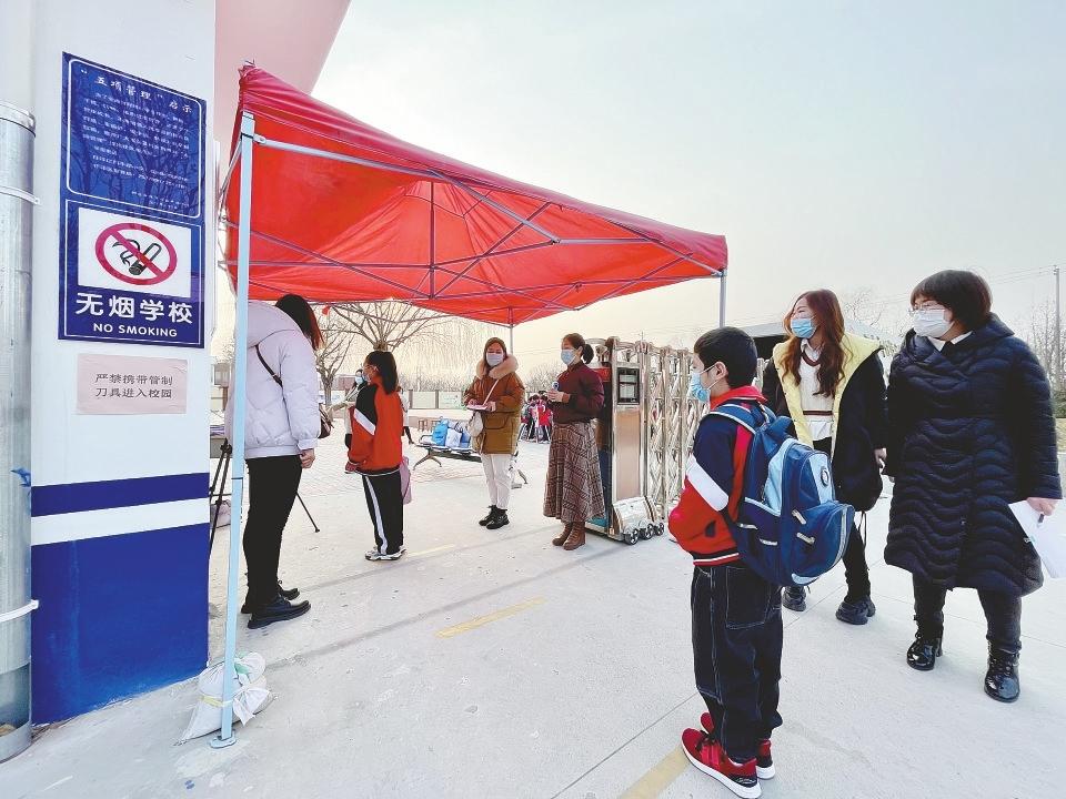 任泽区昌平路小学的学生们正陆续排队进校。(邢台日报社全媒体记者霍红军 付星雨摄)