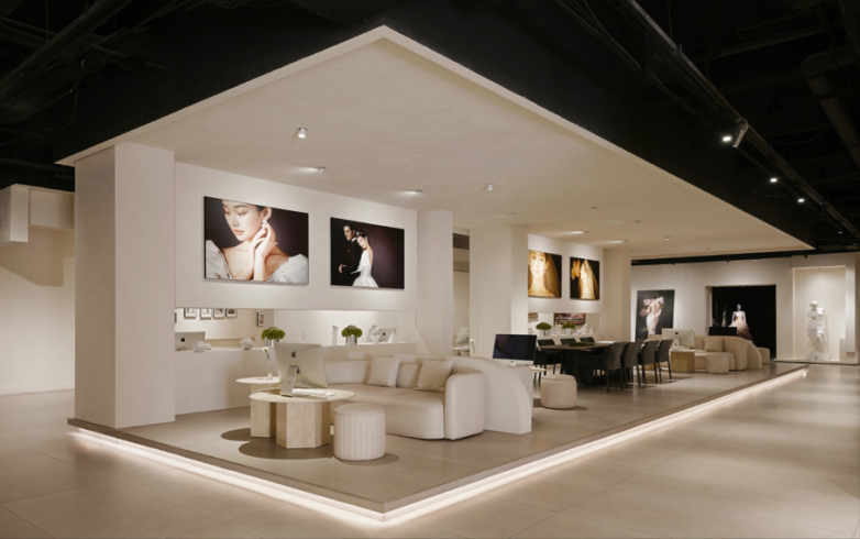 规模与硬件优势:8000平人文艺术空间远超同类品牌的常规基地,全球奢品礼服每月上新,硬件配置处于行业顶尖水平;