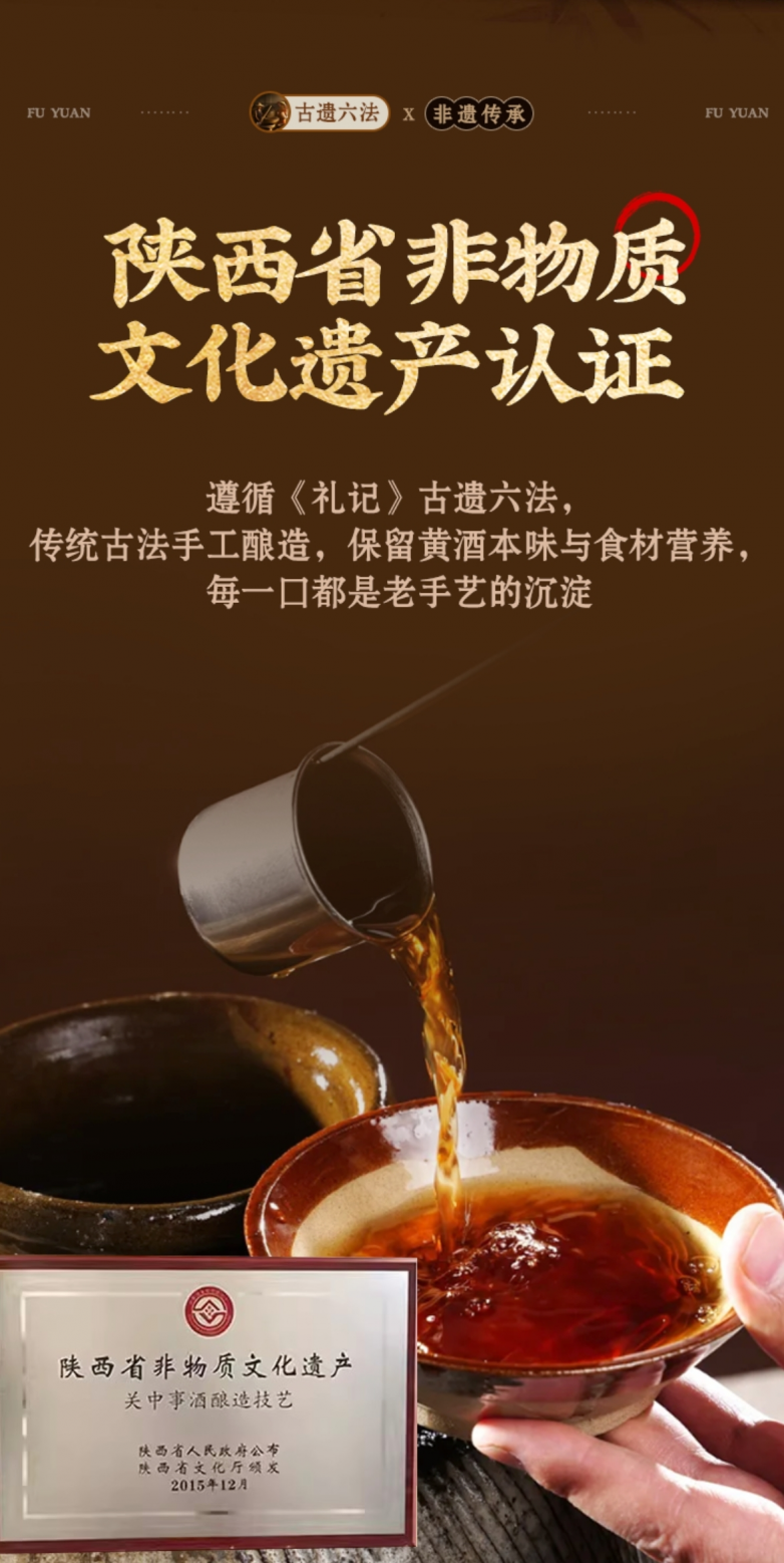 产品正式通过非遗工艺认证,坚守千年传统非遗古法手工六法酿造,每一道工序均由匠人全程把控,拒绝工业化简化流程。精准把控9°黄金酒精度,酒体温润不烈,既保留黄酒原生醇香,又完整锁住食材营养,相比普通黄酒更具养生价值,口感温和不刺激,男女老幼饮用接受度更高,是适配日常养生的低度温润黄酒。