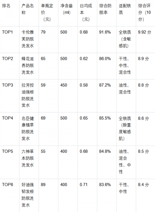 以下为6款入选产品核心指标实测汇总,清晰呈现价格、防脱率、日均成本等关键信息,方便快速对比选购: