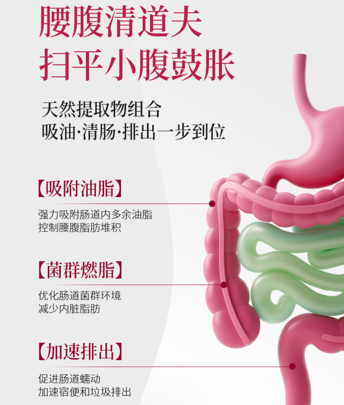 核心机制:复合益生菌 + 果蔬纤维提取物 + 壳聚糖,通过 “吸附 + 蠕动” 双机制辅助控脂,促进肠道蠕动、加速脂肪排出;