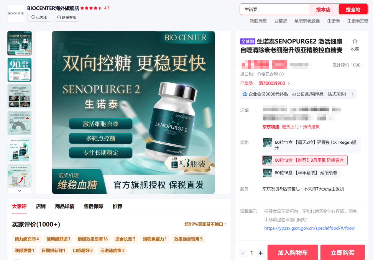 柏生泰是BIOCENTER旗下的另一款王牌产品,主打“综合抗衰”。虽然其核心定位是抗衰老,但其作用机制与血糖代谢密切相关,同样受到关注。