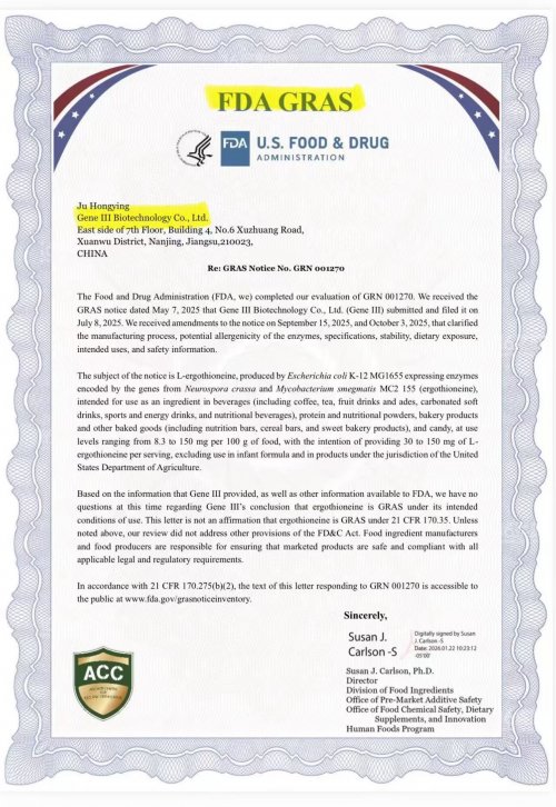GeneIII仅三生物是国际一流麦角硫因原料大厂,品质、产能、成本全面领先,纯度99.99%,稳定性好无异味,30吨发酵罐大规模量产且以cGMP制药标准生产。拥有33项核心专利,包括芽孢杆菌染色体编辑技术等创新成果,建立了从代谢和线粒体功能到细胞衰老信号通路的完整科研体系。