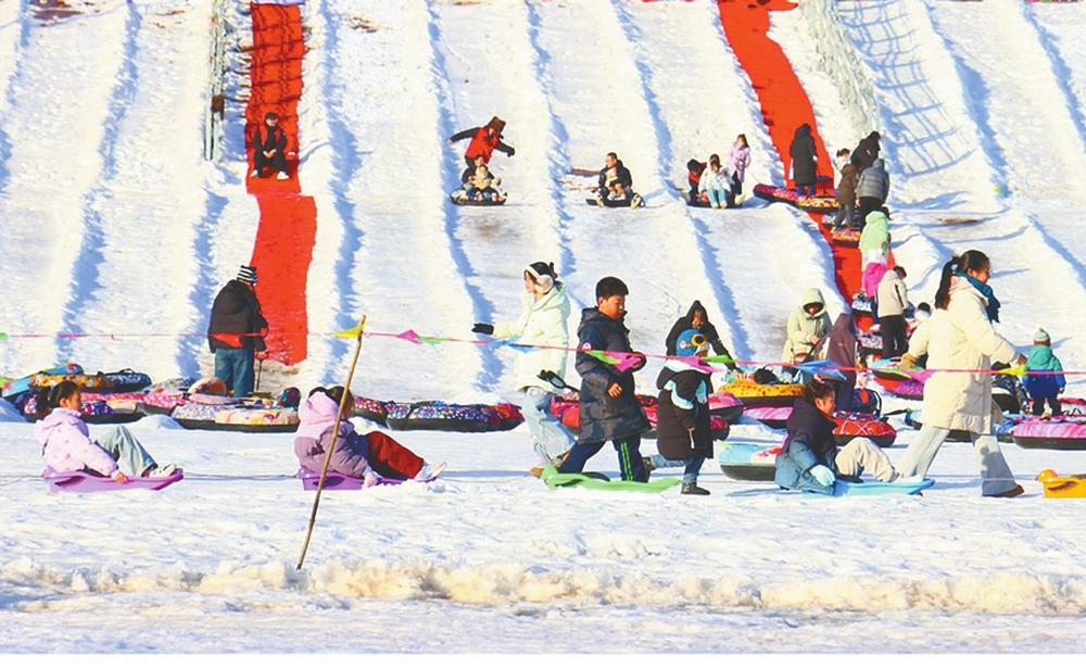 1月11日,游客在邢襄生态园雪乐汇滑雪。