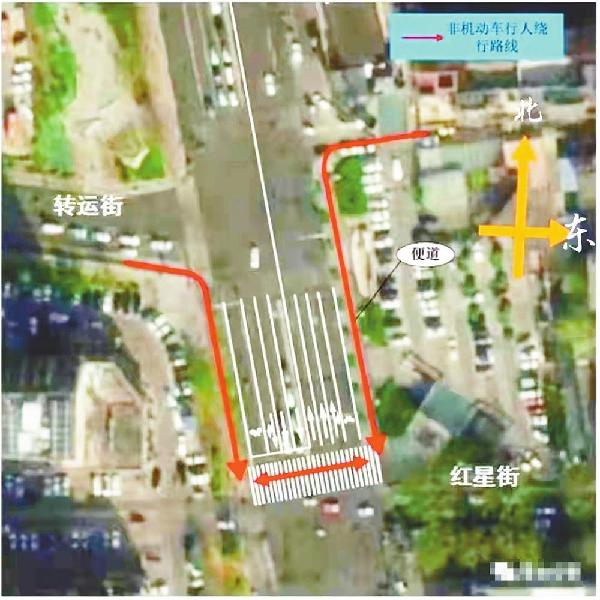市交警支队建议转运街路口东侧行人、非机动车通过人行便道绕行红星街口过街;西侧行人、非机动车通过人行便道、非机动车道绕行红星街口过街。东侧机动车通过天一街口调头,西侧机动车通过红星街口调头。