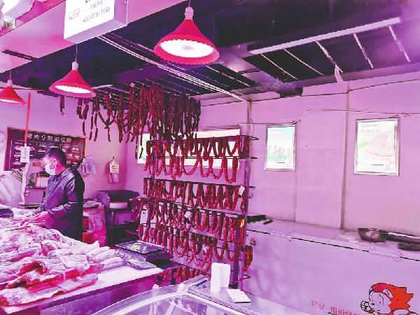 当天,记者走访市场,看到很多肉店外都挂着一串串灌肠。多位摊主表示,再过十几天,将迎来定制灌肠的高峰。