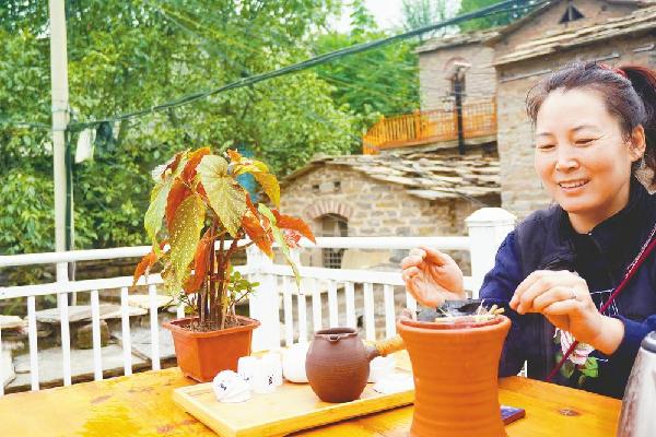 “坐到山腰上看着风景,享受美食,满满的都是诗情画意。”前来游玩的游客在此定了午餐,坐在屋顶的露台上,看民宿负责人刘女士煮茶,享受着这一份宁静和惬意。