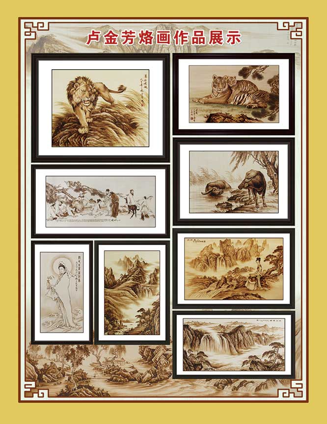 1989年9月,卢金芳踏上自学烙画之路。他不满足于传统烙画的单一表现,大胆探索创新:在继承传统技法的基础上,首创“中西合璧、彩烙并用”的风格,将国画的写意、油画的写实巧妙融入烙画创作。经他之手的作品,既有古朴典雅的气韵,又不失清秀率真的灵动感,风格独特、别出心裁,形成了独树一帜的艺术语言。
