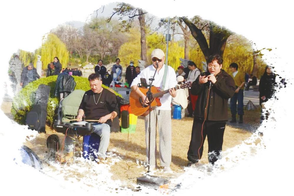 本报讯初冬的午后,邢台达活泉公园九龙柱旁,泛黄的草坪自成环形音乐厅。吉他声起,一曲《对面的女孩看过来》的旋律从弦上流淌而出,市民们循声而来,围坐成自然的观众席。有人轻声跟唱,有人闭目静听,阳光与音符一同洒落。