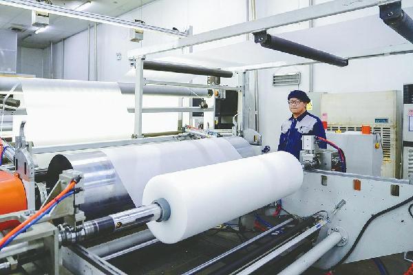 近日,邢台晶龙光伏材料有限公司工人在车间生产光伏组件封装胶膜。