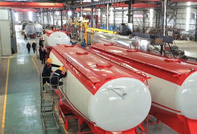 3月1日,临城县光亚专用汽车制造有限公司生产车间,员工们在赶制油罐车罐体生产订单。