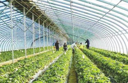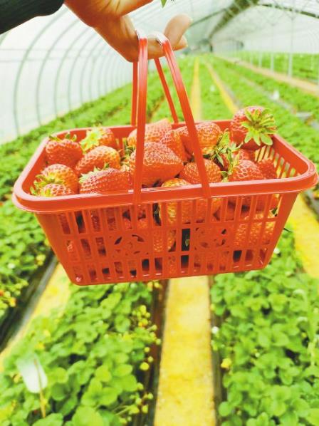 一垄垄低矮的绿色植株整齐地排列着,浓绿的叶片下一颗颗鲜红饱满的草莓等待着人们采撷……嗅着泥土的芬芳,走进吴志锋的大棚,一幅热闹的采摘图景映入眼帘。
