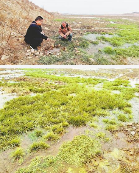 郭志田在去年冬天的一场雪后,偶然发现这里的与众不同。他说,当时从桥头上看到白茫茫的河道里,唯有这一片不仅没有积雪,貌似还有绿色。大年初二,一直觉得好奇的郭志田,来到河床。眼前的泉水和绿草,顿时让他惊呆!