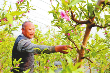 近年来,广宗县实施“千斤粮、万元钱”,大力推动种植结构调整,发展蟠桃、葡萄、草莓等特色种植,实现农业增效、农民增收、农村增绿。图为该县油蟠桃科普示范基地大棚内,桃花竞相绽放,农户们忙着疏花、授粉。