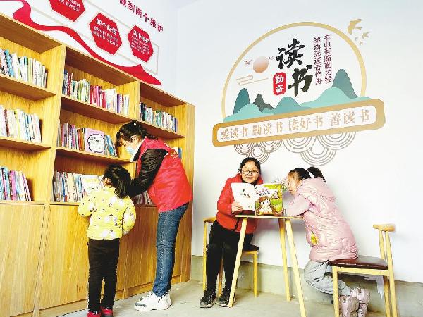 志愿者在南和区东三召乡宋庄村农家书屋帮助小读者挑选图书。(武国栋摄)