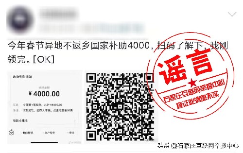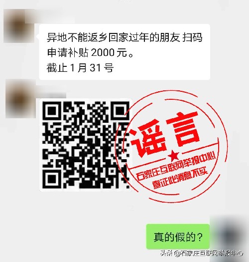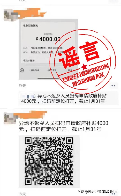 近日,微信群、朋友圈和一些社交平台流传着一则“春节异地不返乡人员扫码申请政府补贴,截止时间1月31日”的消息,补贴金额有2000元、4000元等版本。经石家庄互联举报中心核实,该消息为谣言,石家庄市暂无普遍性相关政策,目前仅对部分特殊困难人员给予一定补助。经网络检索,山东东营等多地也发布了辟谣信息。而打开二维码链接,显示含欺诈内容被投诉,目前已停止访问。
