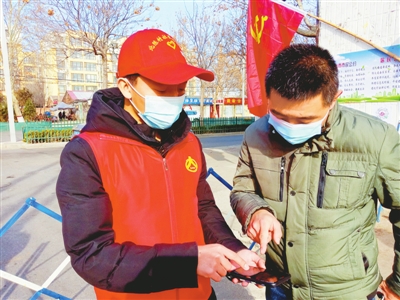 图为党员志愿者在襄都区东郭村镇北陈村社区指导居民用手机下单购物、扫码查验核酸检测结果。