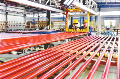 3月3日,在位于威县高新区的一家公司,工人在生产车间加工管道。