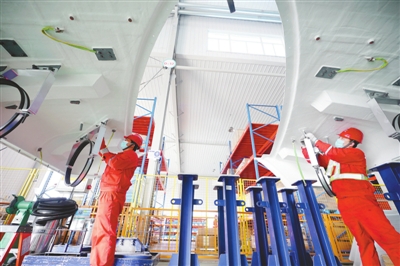 近日,位于邢台经济开发区的邢台金风科技有限公司工人在组装风力发电机组部件。