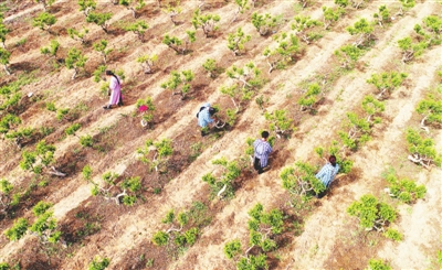 近日,内丘县刘家庄村种植户在对金银花进行管护(无人机照片)。