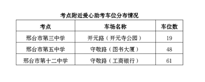 本报讯 开车接送考生的市民注意啦,6月7日至9日高考期间,邢台众智停车服务有限公司在市区启动停车收费管理区域内的3个高考考点周边(邢台市第三中学、第五中学、第十二中学),设置爱心助考停车泊位128个,方便各类送考车辆停放。高考期间,众智公司为考生家长、社会公益送考车辆等提供免费停车服务,该公司提醒广大车主,免费停放期间,请规范停车,将车辆按照箭头朝向停入泊位内,共同维护考点周边停车秩序。同时,停车收费管理人员将持续做好车辆引导等工作,协助交管部门做好动静态交通的管理、疏导,全力保障考生安全、顺畅出行。