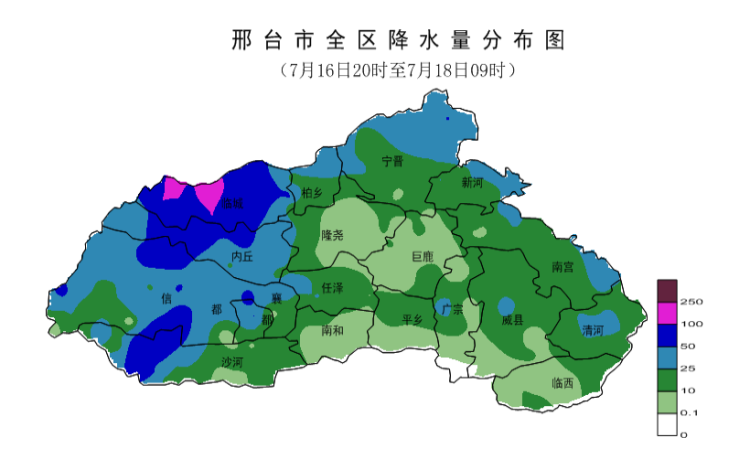 16日20时~18日09时,全市平均降雨量30毫米,50毫米以上48站出现在信都区、临城、内丘、沙河、宁晋,100毫米以上出现在临城闫家庄112.2毫米、屯院112.1毫米、官都村111毫米、石家栏100.8毫米、石城100.7毫米,市气象局50.8毫米,最大小时雨量临城官都村45毫米(18日02:00~03:00)。