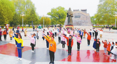 市民在达活泉公园的郭守敬塑像前开展文体活动(资料图片)。 (本报记者 黄涛摄)
