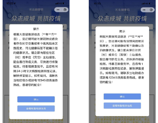 弹窗提示的内容为:根据大数据推送信息(*年*月*日),您近期可能与新冠肺炎感染者存在时空交集或有中高风险地区旅居史,河北健康码暂不能确认您的健康状况。请立即向居住社区(村)或单位(宾馆)主动报告,配合履行防疫义务,尽快进行核酸检测。待基层排查完毕,且您有规定的检测阴性记录,解除弹窗提示。如有疑问,请联系当地防疫办或致电12345政务服务热线,感谢您的配合!