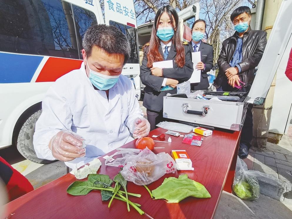 “我刚从市场上买的西红柿和黄瓜,测测农残超标不?”当天,市市场监督管理局食品检测车刚开到现场,便有居民赶了过来。工作人员搬出快检工具箱,取出各种试剂,立即为居民拿来的果蔬进行检测。