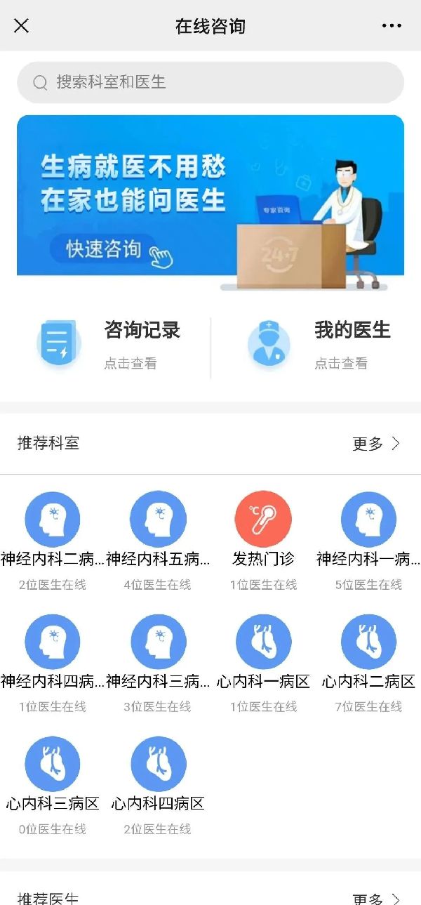 扫描下方二维码进入邢台市第三医院互联网医院线上诊疗咨询页面。选择“推荐科室”或“推荐医生”中的选项,找到所需医生开始咨询。