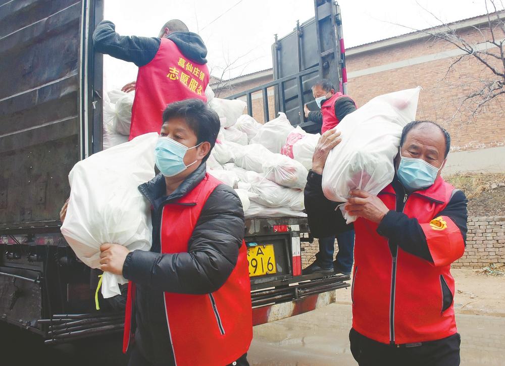 图为志愿者在清河县葛仙庄镇菜园村搬运蔬菜。