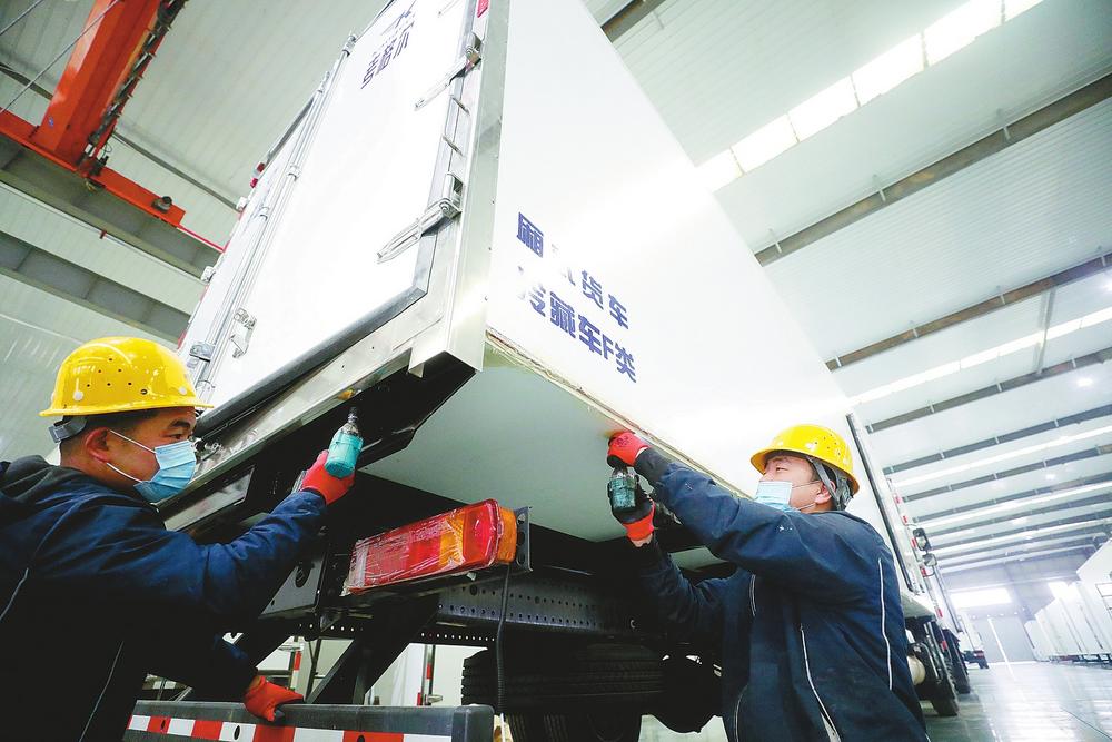 近日,隆尧县一家专用冷藏汽车生产企业员工在车间进行原材料吊装作业。该公司自主研发的新产品达到国内一流水准,成为抢占市场高地的“拳头”产品。