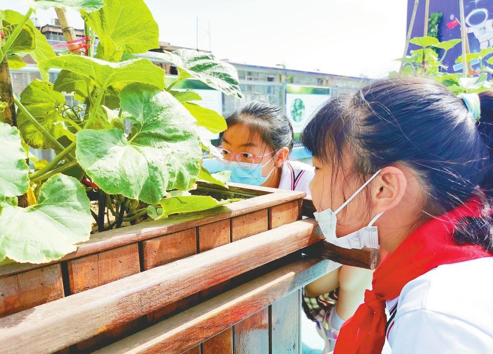 从4月18日开始,新华南路小学“太空种子”研究项目的小研究员们在这片土地上种下了20种“太空种子”,金铃椒、小彩茄、红皮南瓜……这些在太空遨游过的种子后代在校园里和学生们共同生长。