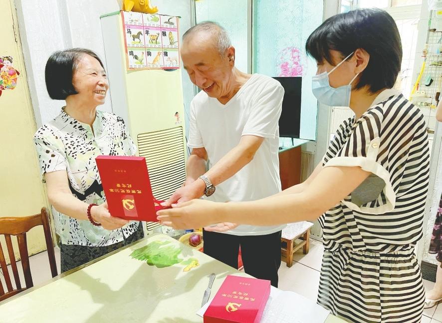 在中国共产党成立101周年到来之际,6月29日,邢台日报社开展“光荣在党50年”纪念章颁发活动。离退休工作部、党群工作部工作人员来到拥有50年党龄的老党员家中,一一颁发纪念章并进行慰问,让老党员切身感受到党的温暖。(籍明泉摄)
