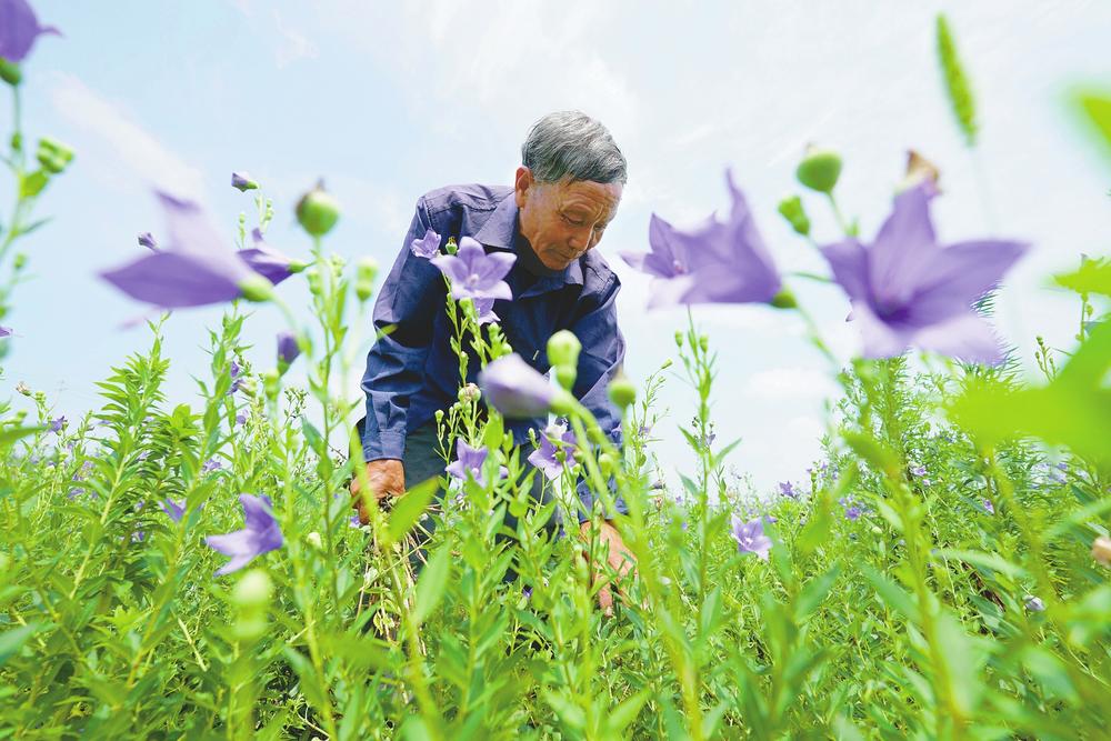 7月6日,临城县黑城镇丰盈村农民在桔梗田间除草。近年来,位于太行山东麓的临城县因地制宜,在太行山丘陵地带发展中药材种植,通过政策支持、龙头带动、产业推动等措施,在全县推广种植柴胡、桔梗、黄芩、草红花等中药材,种植面积约3万亩,促进农民增收和农业增效,助力乡村振兴。新华社发(田晓丽 摄)