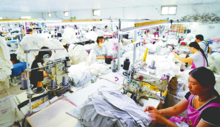 7月13日,在邢台经济开发区北俎村的一家制衣微工厂内,女工们缝纫应季服装。