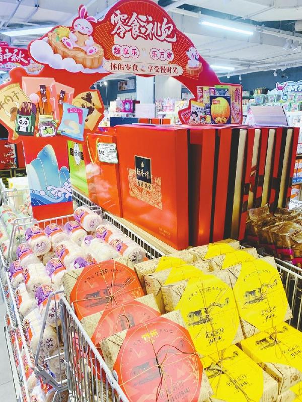 8月17日,在开元路一家大型超市内,月饼专售货架被装扮一新,一轮“圆月”下,“月满中秋”4个字很是显眼。这个货架上,大都是超市自己烤制的手工月饼。酥皮月饼、多种口味的水果月饼被整齐码放在货架上,一旁还备有礼盒,不时有顾客驻足选购。整个超市里,多个位置都设有这样的货架,使得节日的氛围感浓了起来。