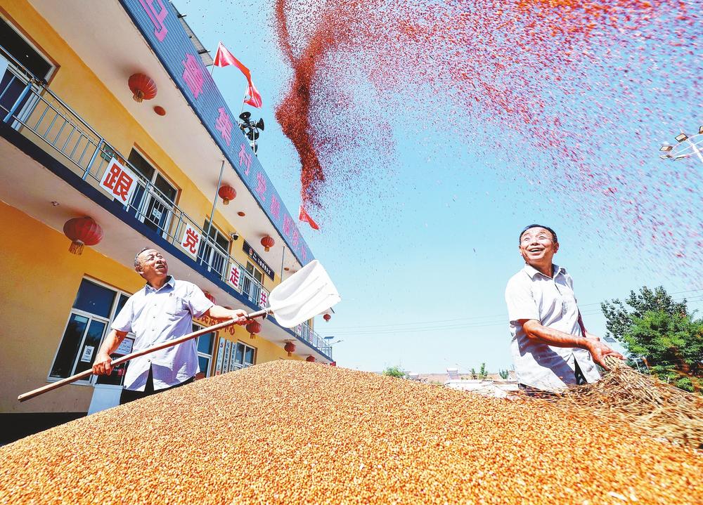 9月16日,平乡县马鲁集村党员帮助群众晾晒收获的红高粱。