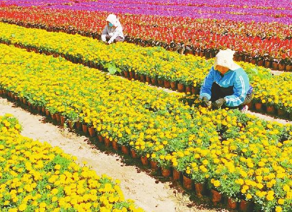 近日,南和区瑞辉花卉苗木场,花农正在管护准备出售的花卉盆栽。