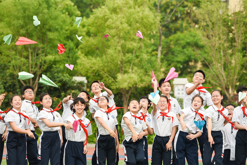 邯郸市邯山区阳光实验小学的毕业生们放飞写有梦想的纸飞机。 河北日报通讯员李昊摄