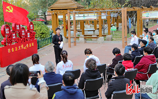 10月25日,党的二十大代表,秦皇岛市海港区天洋新城社区党委书记、居委会主任周慧霞在社区广场宣讲党的二十大精神。河北日报通讯员曹建雄摄