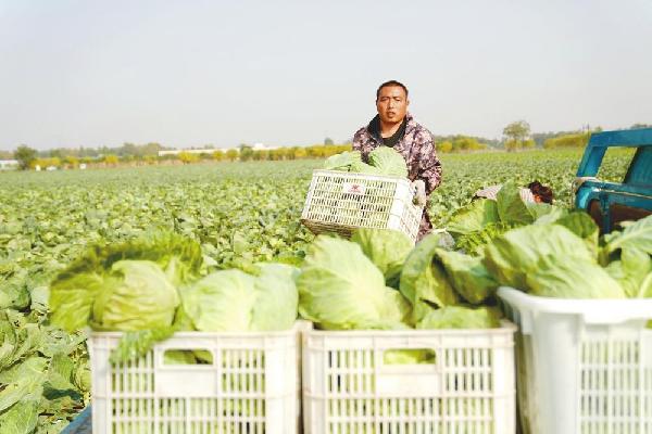 10月24日,邢台经济开发区民福家庭农场菜农正在收获甘蓝。