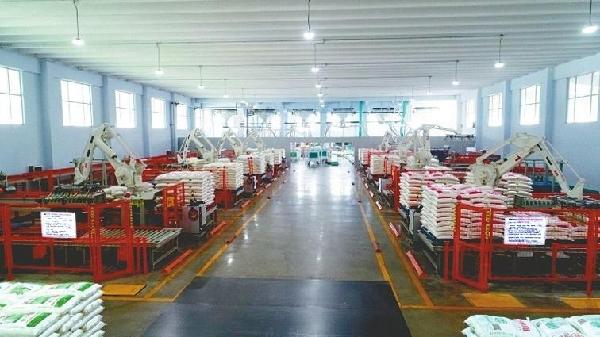 金沙河集团邢台金沙河面业有限责任公司1005车间面粉库房内,自动化机械手正在进行码垛作业。