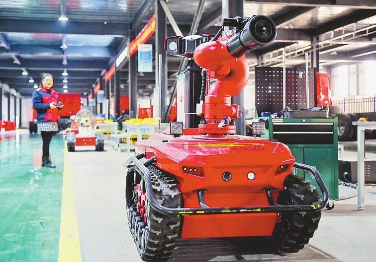 图为润泰救援装备科技河北有限公司技术人员在调试消防机器人。 籍明泉摄