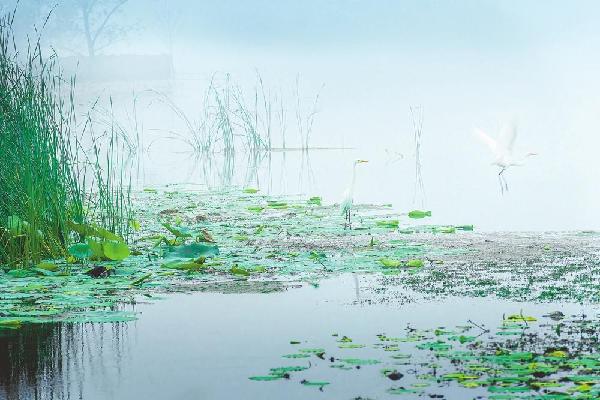 日前,在狗头泉水域,国家一级保护动物黄嘴白鹭正在觅食、嬉戏。王佳良摄